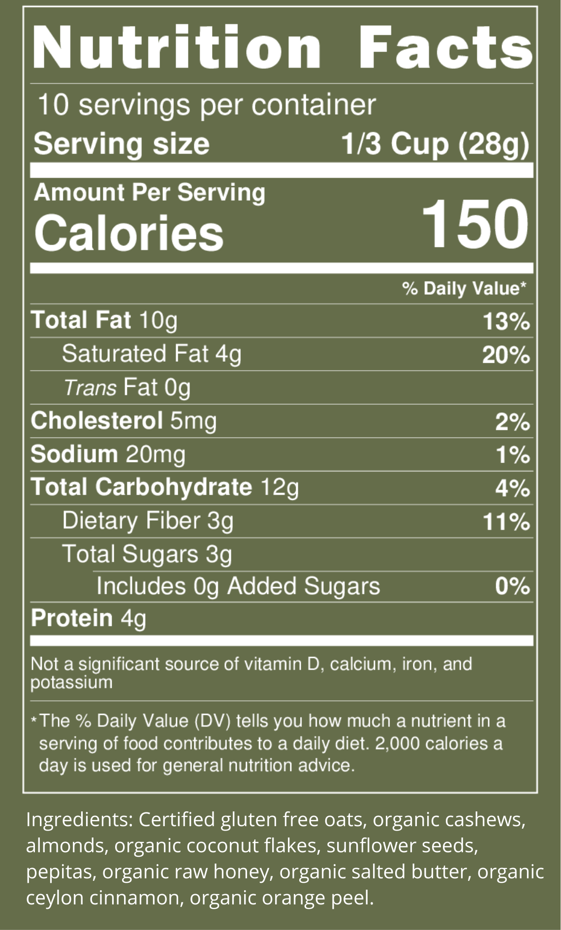 Ingredients: Certified gluten free oats, organic cashews, almonds, organic coconut flakes, sunflower seeds, pepitas, organic raw honey, organic salted butter, organic ceylon cinnamon, organic orange peel.